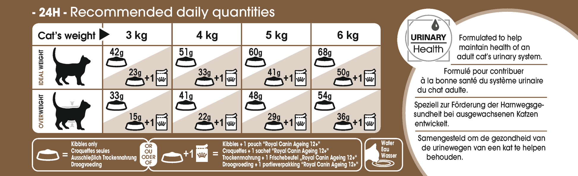 ROYAL CANIN® Senior Ageing 12+ torrfoder är lämpligt för katter över 12 år och speciellt utvecklat för näringsbehovet hos äldre katter som din. Fodret har mycket välsmakande foderbitar med en unik textur (krispig utanpå, mjuk inuti) som bidrar till att stimulera din äldre katts aptit. ROYAL CANIN® Senior Ageing 12+ innehåller antioxidanter som stödjer äldre katter genom åldrandet. Tack vare en måttlig fosforhalt hjälper det också till att stödja njurhälsa, vilket är mycket gynnsamt för äldre katter. För att tillgodose alla katters individuella preferenser finns ROYAL CANIN® Senior Ageing 12+ även som våtfoder bitar i smakrik sås eller gelé. Om du använder blandad utfodring behöver du bara följa riktlinjerna i vår foderguide för att säkerställa att din katt får rätt mängd våt- och torrfoder för bästa möjliga hälsofördelar.