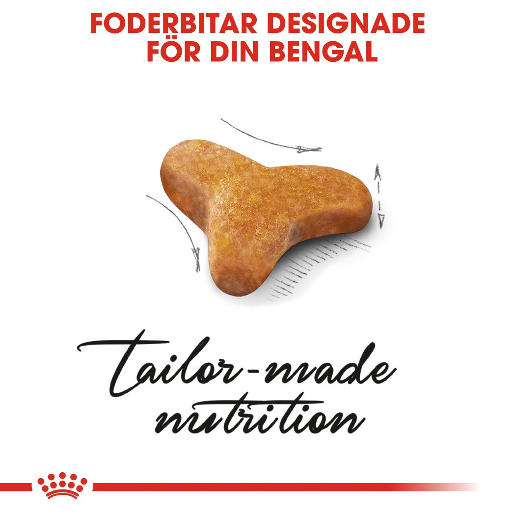 ROYAL CANIN® Bengal Adult torrfoder för vuxna katter är utformad med tanke på näringsbehovet hos din bengalkatt. Hög proteinhalt och anpassad fetthalt gör att fodret bidrar till att bibehålla din bengals muskelmassa och mycket aktiva livsstil.En mycket lättsmält, proteinrik kost är av vikt för en hälsosam matsmältning hos din bengal. Därför innehåller ROYAL CANIN® Bengal Adult foder LIP-proteiner, ingredienser som är utvalda för sin höga proteinsmältbarhet. Det inkluderar också prebiotika som bidrar till att främja balansen i tarmfloran. Din bengals blanka päls behöver särskild uppmärksamhet och vård för att hållas i toppskick. ROYAL CANIN® Bengal Adult foder innehåller en specifik balans av aminosyror, vitaminer samt omega-3 och omega-6 fettsyror som bidrar till att bibehålla glänsande päls och hälsosam hud.