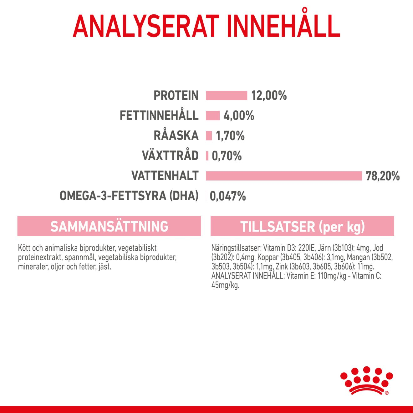ROYAL CANIN® Kitten Gravy har tagits fram för att göra de mest kräsna katter belåtna. Det här våtfodret bidrar till en positiv sensorisk upplevelse samtidigt som det stödjer din kattunges vätskeintag. Det fungerar även alldeles utmärkt som blandad utfodring med ROYAL CANIN® Kitten-torrfoder.