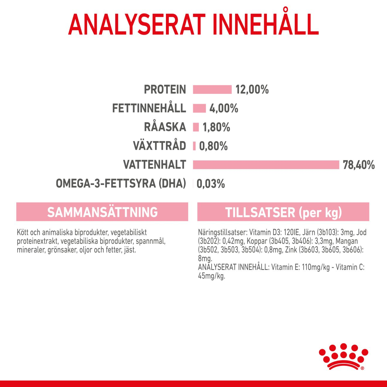 ROYAL CANIN® Kitten Loaf har tagits fram för att göra de mest kräsna katterna belåtna. Det här våtfodret ger en positiv sensorisk upplevelse och stödjer din kattunges vätskeintag. Det fungerar även alldeles utmärkt som blandad utfodring med ROYAL CANIN® Kitten-torrfoder.