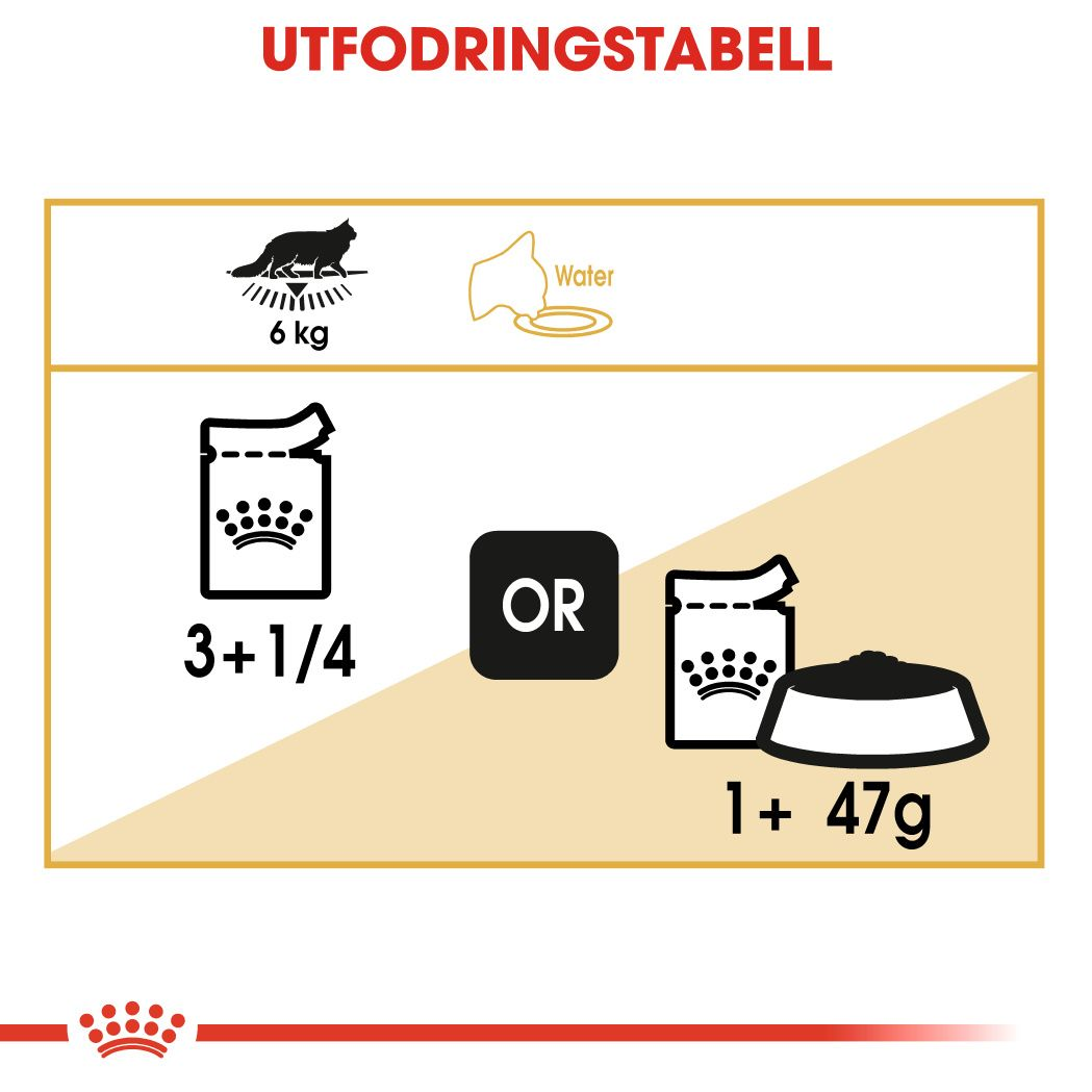 ROYAL CANIN® Maine Coon Adult våtfoder i sås är speciellt utformat just för denna ras. Du kan vara säker på att det är lika viktigt för oss att tillgodose din Maine Coons näringsbehov som det är för dig. Särskild uppmärksamhet måste ägnas åt att främja ledernas allmänna hälsa och tillstånd. Det är berikat med taurin, DHA och EPA (omega-3-fettsyror) för att bibehålla muskel- och skelettstyrka och stödja en hälsosam hjärtfunktion. ROYAL CANIN® Maine Coon Adult i sås har också ett mycket högt innehåll av energi för att ge din storvuxna katt den energi den behöver varje dag. Maine Coon-katten har en tät, tjock semilång päls med silkesartad underpäls. Kostens specifika aminosyror, vitaminer, Omega-3- och Omega-6-fettsyror bidrar till att bibehålla kattens hud- och pälshälsa. För att tillgodose alla katters preferenser finns ROYAL CANIN® Maine Coon Adult i sås även som torrfoder med krispiga och välsmakande foderbitar. Om du använder blandad utfodring behöver du bara följa riktlinjerna i vår foderguide för att säkerställa att din katt får rätt mängd våt- och torrfoder för bästa möjliga hälsofördelar.