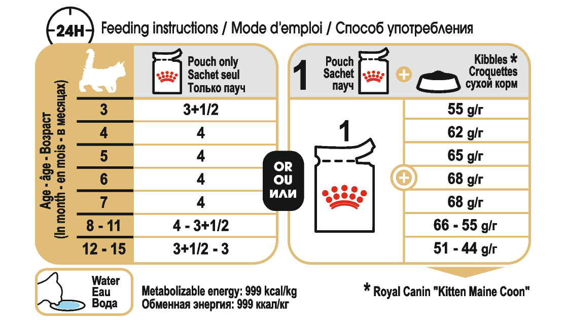 | Kombinera: torr- och våtfoder | 1/2 burk Mother & Babycat + 45-76 g | 1 pouch Kitten + 56-87 g | 1 pouch Kitten + 56-72 g | 1 pouch Kitten + 43-59 g |