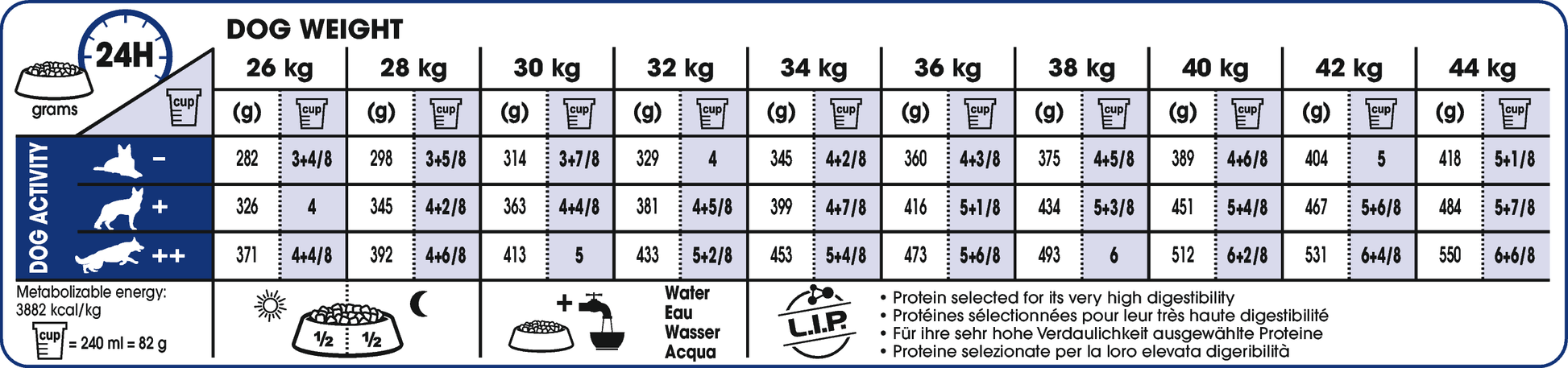| 26 kg | 282 g (3+4/8 fodermått) | 326 g (4 fodermått) | 371 g (4+4/8 fodermått) |