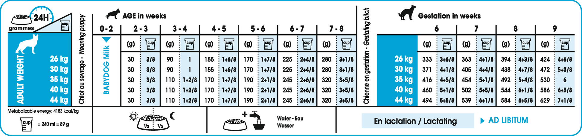 | 30 Kg | 372g | 445g | 439g | 520g | ad libitum |